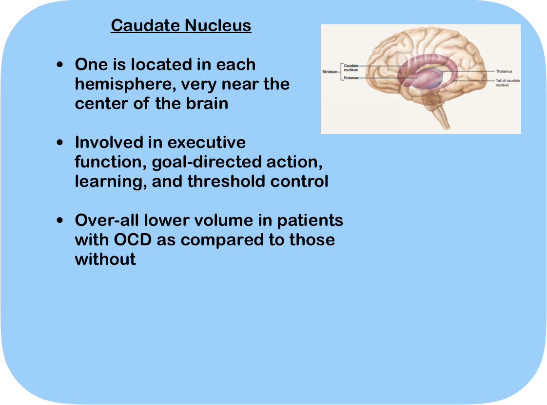 The Caudate Nucleus is different from the other two areas that we’ve looked at because there’s actually one in each hemisphere of the brain. Most scholarly articles about the Caudate Nuclei describe them as “C” shaped, but I think they look more like tadpoles, or something a little less SFW, but I digress. Overall, the Caudate Nucleus is smaller in people diagnosed with OCD than it is in people without the disorder, implying that there is reduced or limited function. Limited function in the Caudate Nucleus would mean limited goal-directed action, which could be a vital part of the development of OCD.